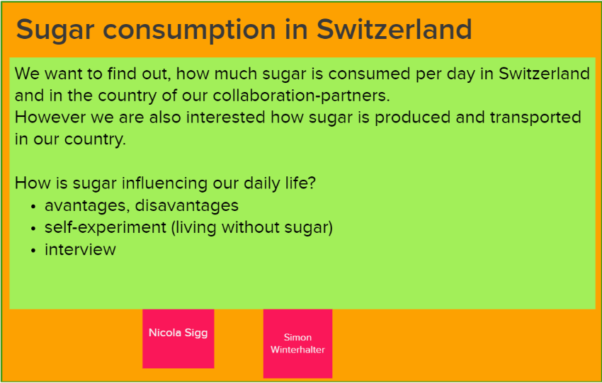 Our vision is to show the production of our finished products and food that we buy in the stores. For this we decided to make a collaboration with a group from Germany or India to show how it is done in their country and what they pay attention to. In addition, Nicola and I will do a small project where we will both completely abstain from industrially produced sugar for at least 1 week and then evaluate our results and experiences.